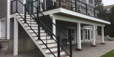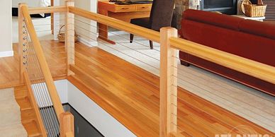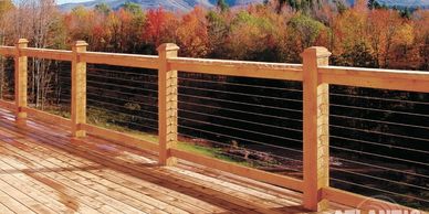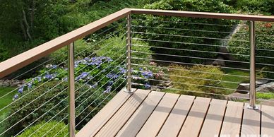 Spectrum Cable Railing features powder-coated aluminum posts paired with stainless steel cable infill and a customer-supplied wood top rail. This system blends modern materials with the warmth of wood for a clean residential look.