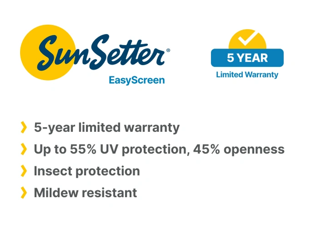 SunSetter’s 10% Solar Screen fabrics maintain your views while reducing the glare and heat from the hot sun. Made of vinyl coated polyester, SunSetter’s 10% Solar Screens block out up to 90% of UV rays and provide increased airflow with a 10% openness. Backed by a 5-year warranty, SunSetter Solar Screens are mildew-resistant, making them easy to clean and maintain for years.